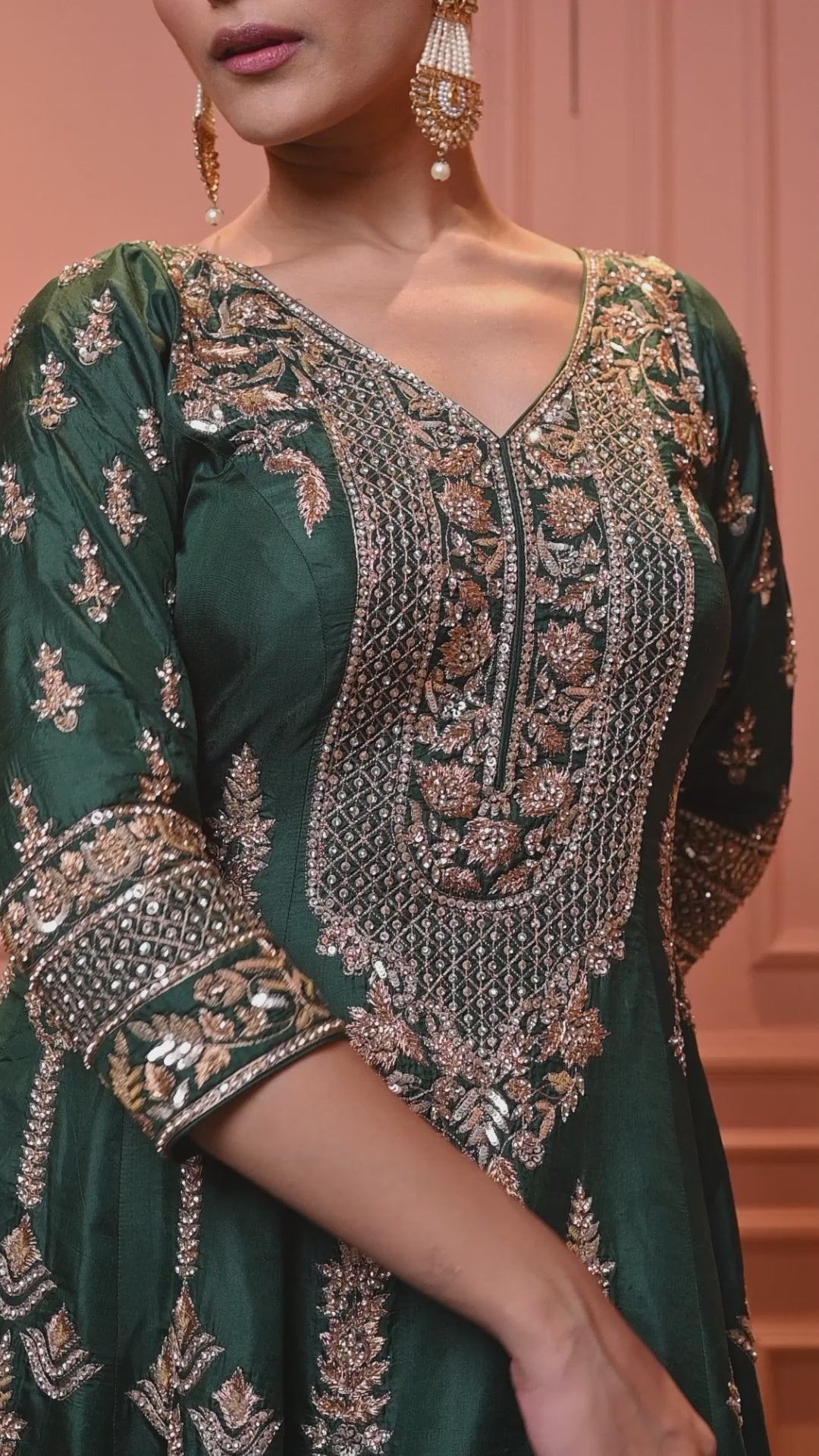 Bottle Green Short Anarkali With Nakshi And Sequins Kaam