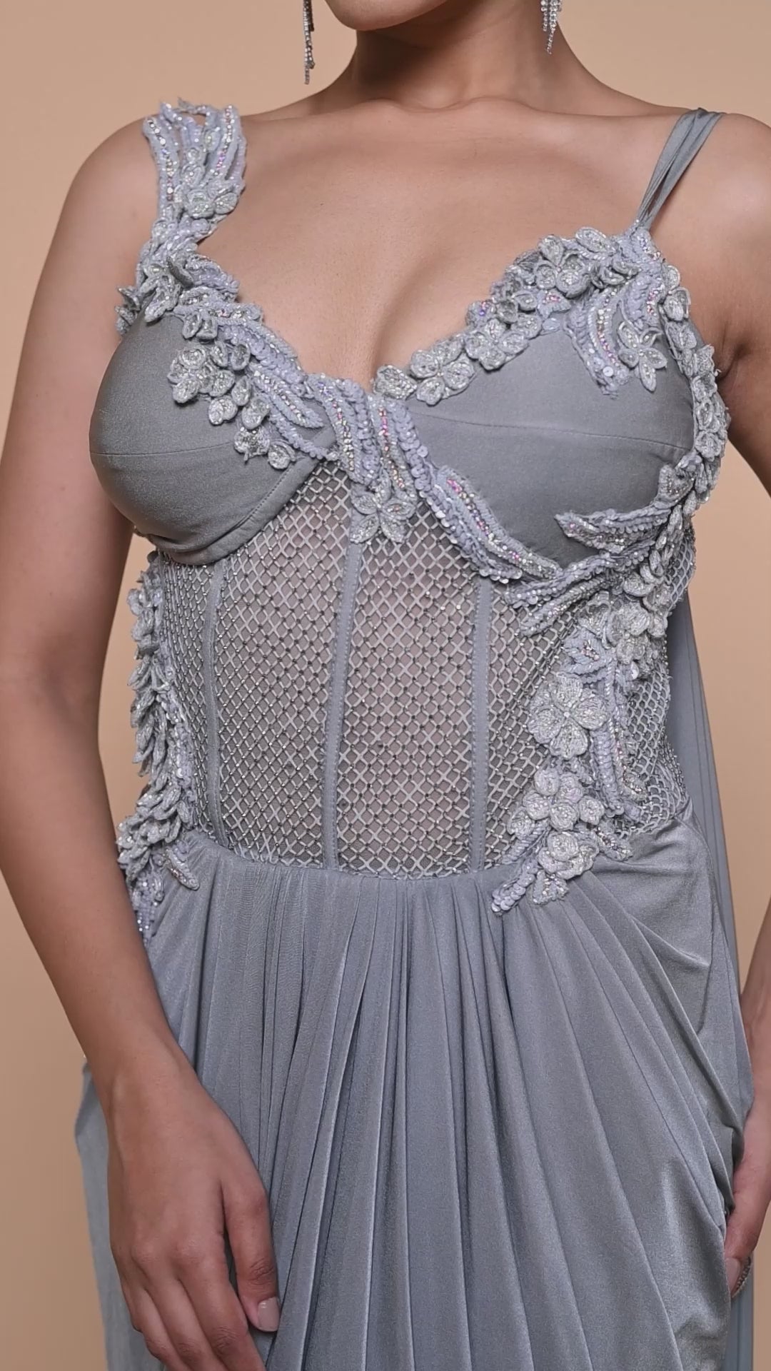 Grey Lycra Drape Saree With Resham Cutdana Work