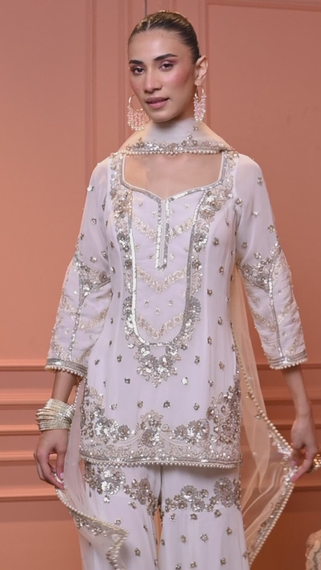 White Georgette Gharara Suit With Pearl, Sequins And Poth Work